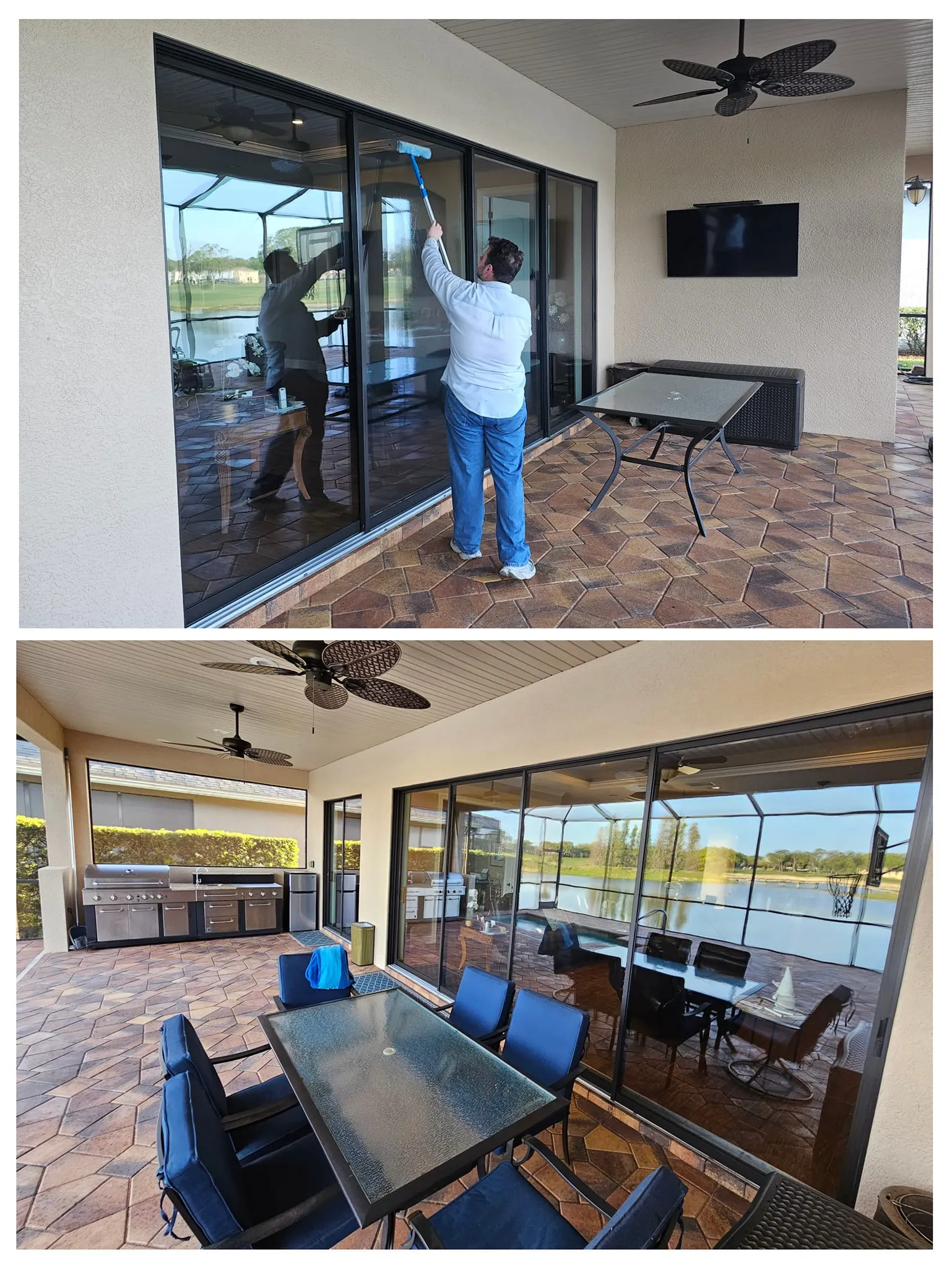 Spring: Clean pollen and mildew buildup, Summer: Prep patios and decks for entertaining, Fall: Clear gutters and remove leaf stains, Winter: Prevent mold and algae growth in shaded areas